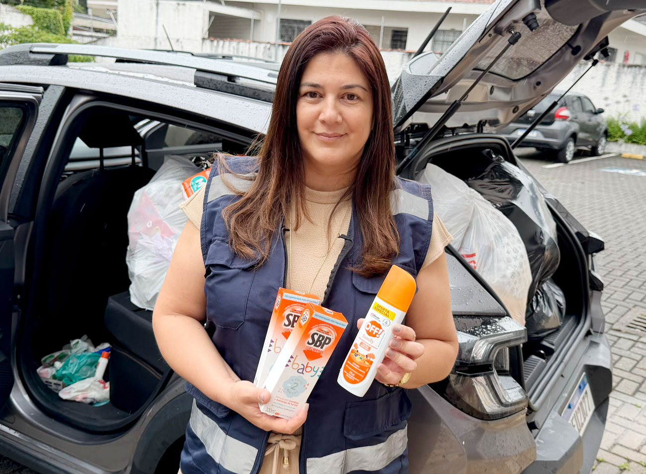 A psicóloga Carla Slongo exibe embalagens de repelentes, um dos itens mais demandados pelas famílias de Rio Bonito do Iguaçu © CRP-PR