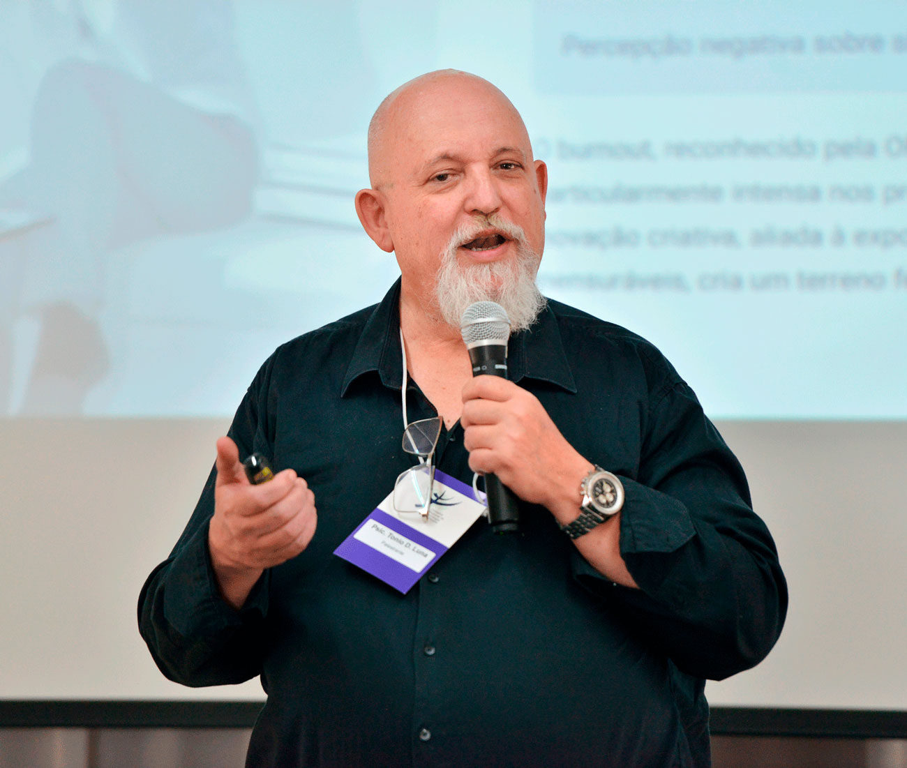 Ele provocou o público com uma pergunta direta: “Será que os profissionais da comunicação têm tempo para descansar, meditar ou simplesmente respirar?” — apontando que a sobrecarga emocional e a falta de limites são condições frequentemente naturalizadas nessa área.